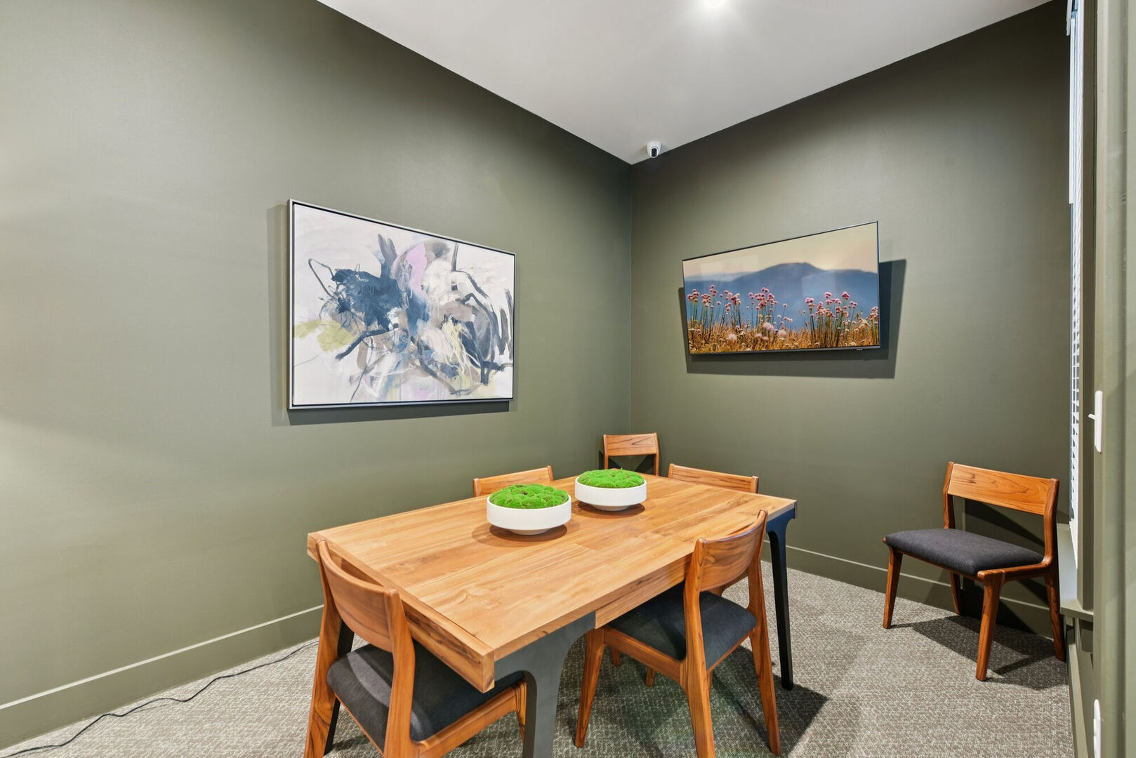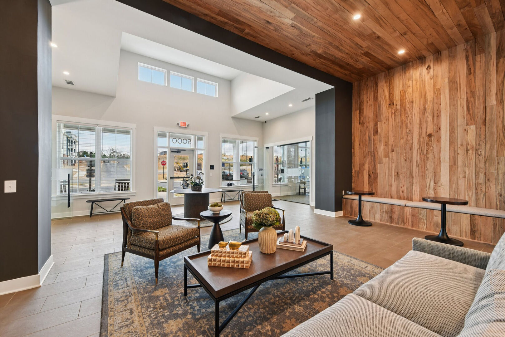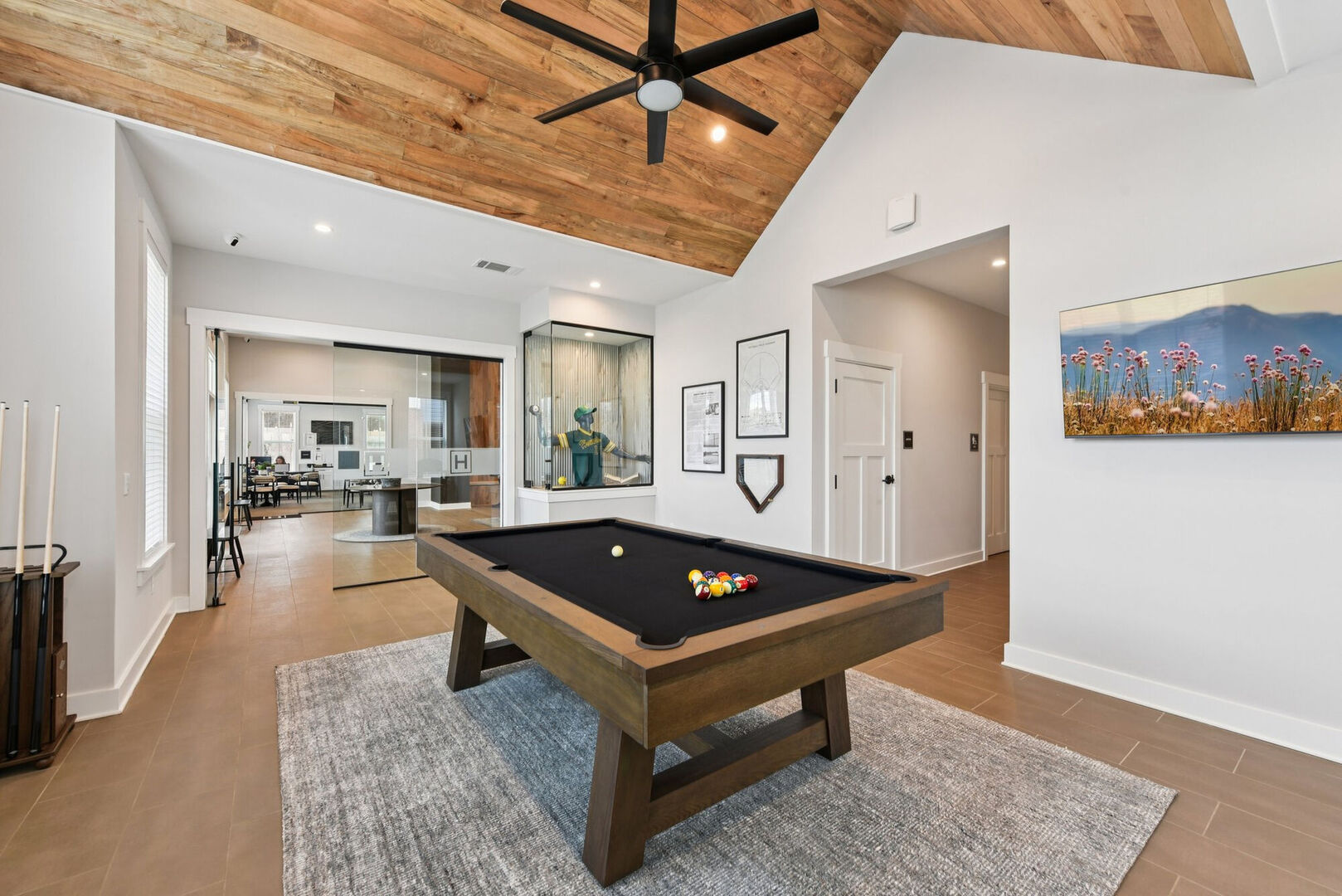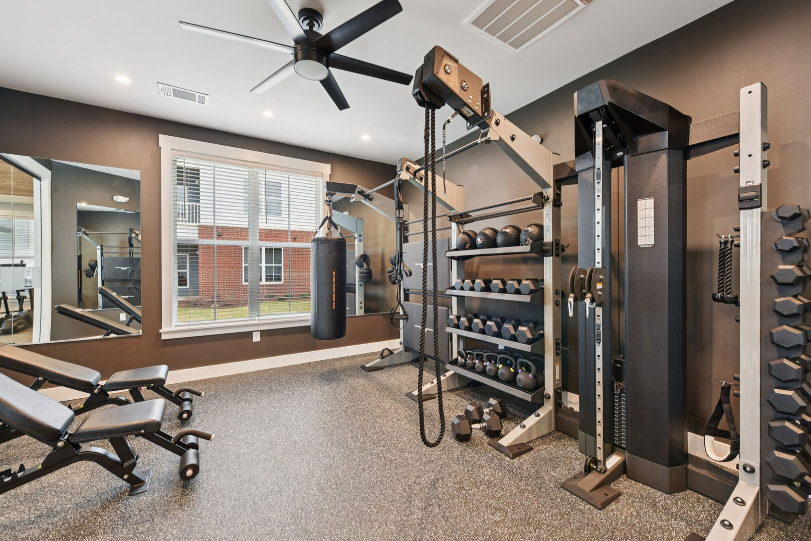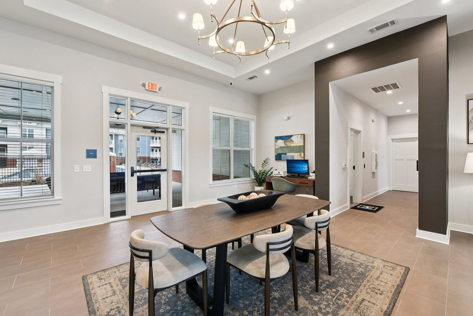 social room with fireplace, entertainment room, fitness room to our